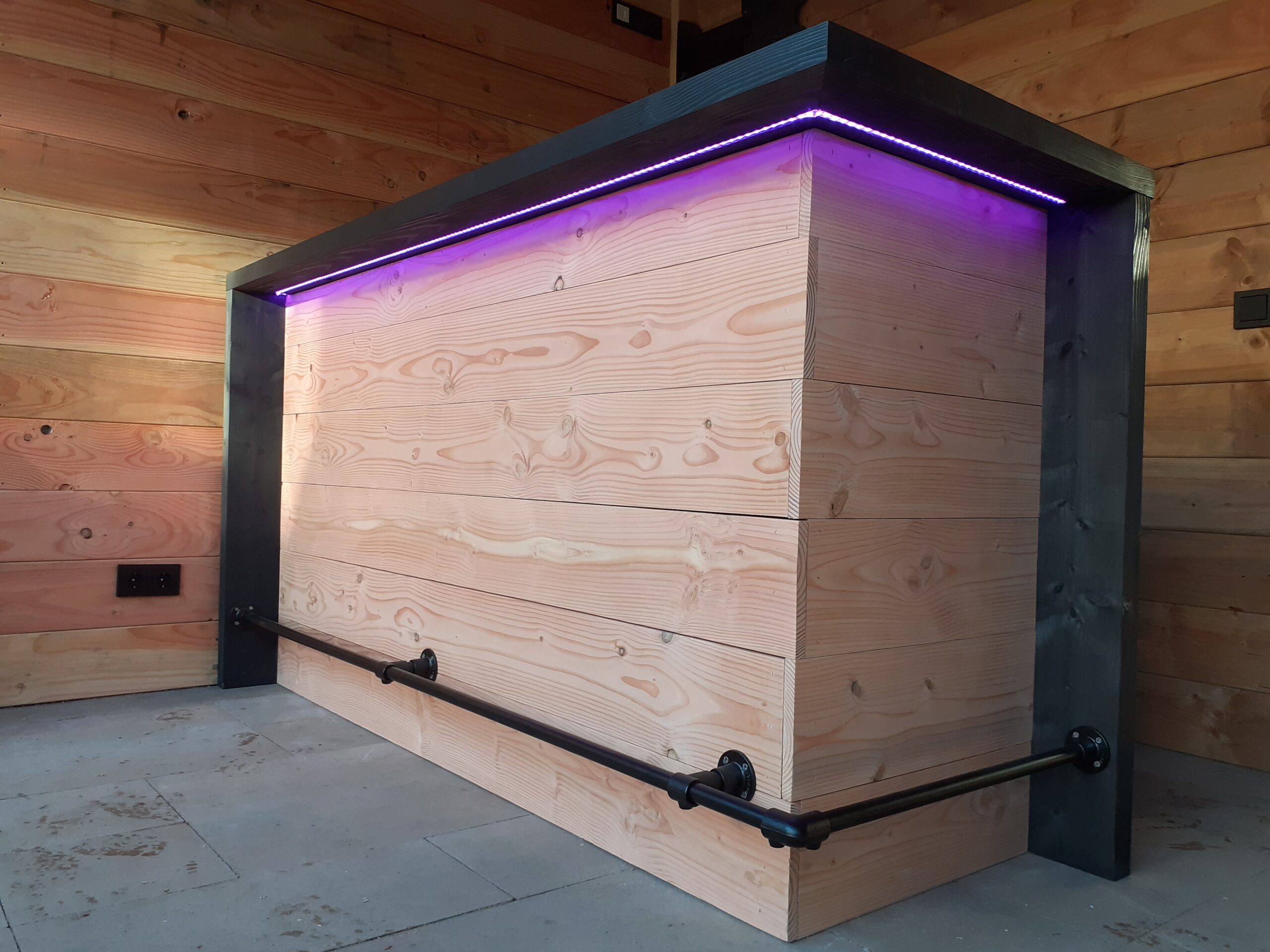De steunpalen van de overkapping waren zwart geverfd, dus we hebben dit detail doorgetrokken in het design van de bar. De combinatie van Douglas hout met zwarte elementen zorgt voor een stoere, industriële uitstraling. We hebben een dunnere steigerbuis gebruikt, omdat deze beter in verhouding is met de bar. Uiteraard mocht sfeervolle LED-verlichting niet ontbreken, wat de bar zowel functioneel als stijlvol maakt.