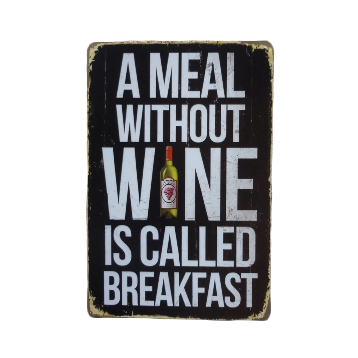 Breng een vleugje humor en stijl in je interieur met het A Meal Without Wine metalen bord. Dit 20 x 30 cm wandbord is een perfecte toevoeging aan je keuken, eetkamer, bar, mancave of terras. Met zijn speelse en herkenbare boodschap is het ideaal voor wijnliefhebbers die hun muurdecoratie net dat beetje extra karakter willen geven.