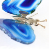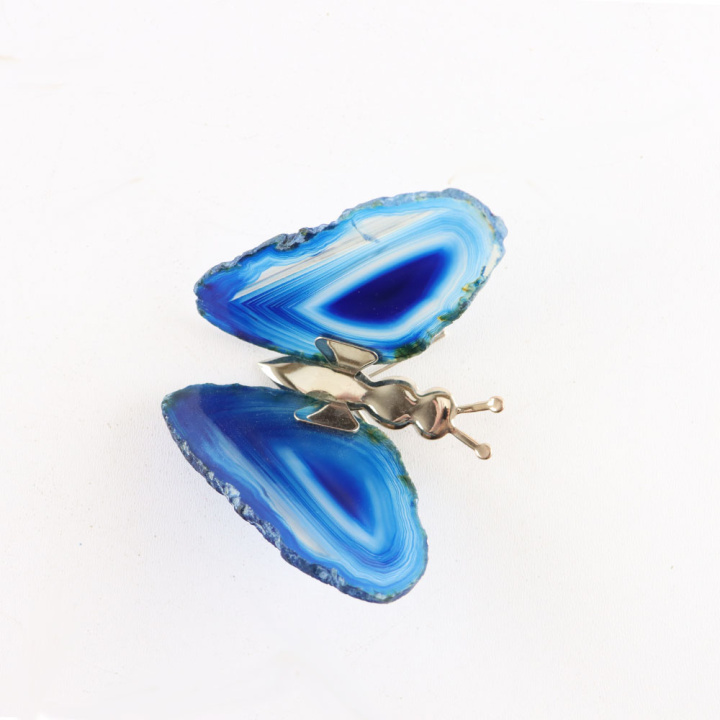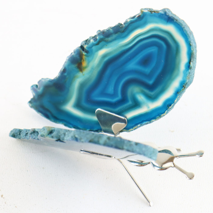 Agaat is een halfedelsteen die miljoenen jaren geleden is gevormd in vulkanisch gesteente. Door de afzetting van laagjes siliciumdioxide in holtes van lava ontstaat de kenmerkende gelaagde structuur die agaat zo bijzonder maakt. De diepblauwe kleur van deze vlinder is zorgvuldig gekozen en versterkt de natuurlijke patronen en glans van de steen.