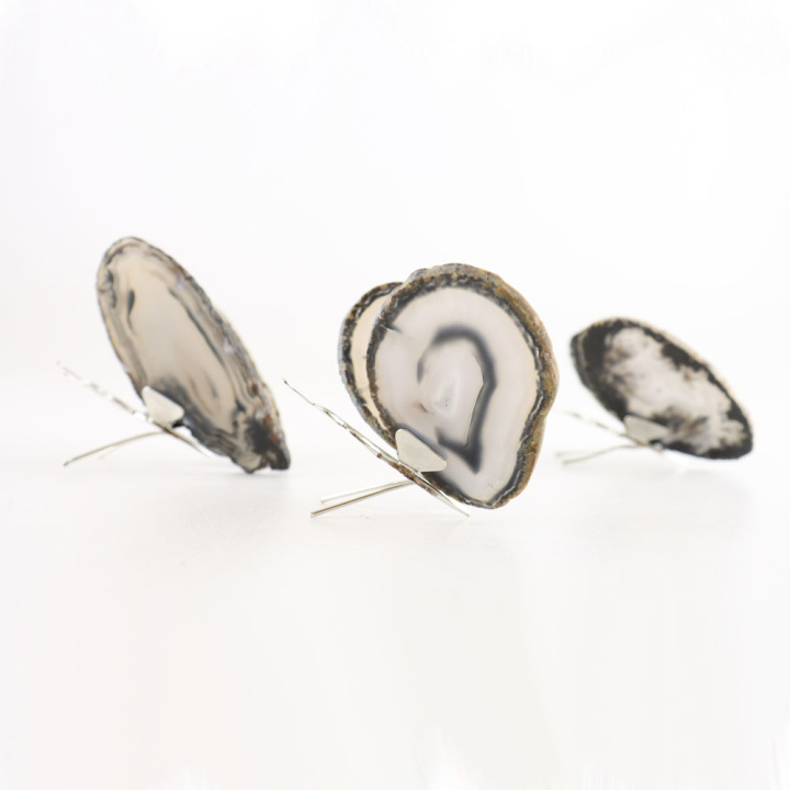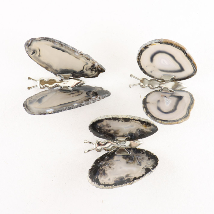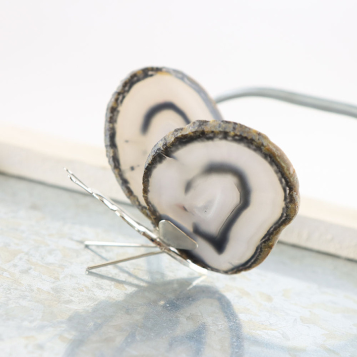 Agaat is een halfedelsteen die miljoenen jaren geleden is gevormd in vulkanisch gesteente. Door de afzetting van laagjes siliciumdioxide in lavaholtes ontstaan de kenmerkende patronen en kleurvariaties van deze steen. De wit-bruine tinten van deze vlinder zijn volledig natuurlijk en maken iedere vlinder uniek. Agaat is afkomstig uit verschillende delen van de wereld, waaronder Brazilië, India en Mexico, en wordt met zorg gepolijst om zijn natuurlijke gelaagdheid te accentueren.