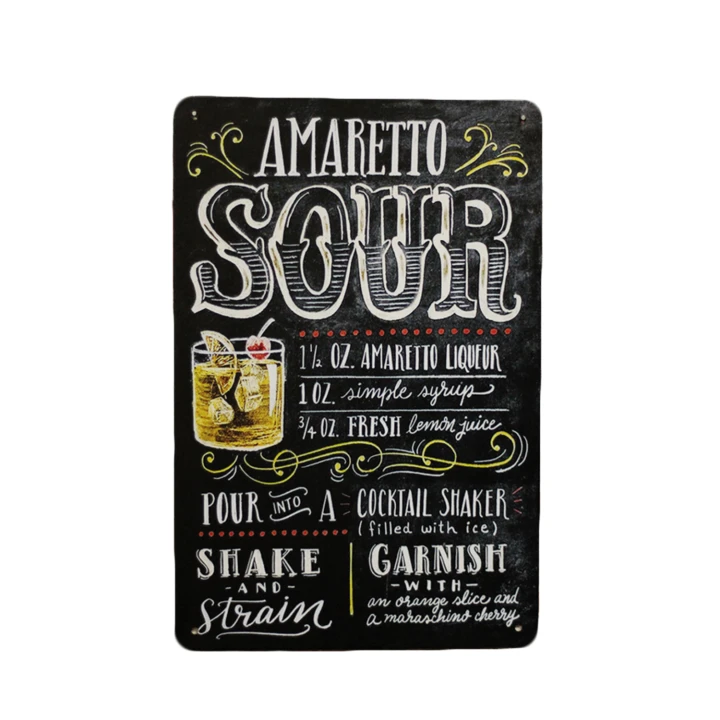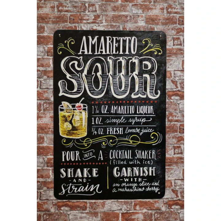 Het Amaretto Sour metalen bord is gemaakt van stevig metaal en bedrukt met eco-vriendelijke inkt. Dankzij de UV-bestendige afwerking blijven de kleuren helder, ook bij gebruik buitenshuis. Hierdoor is het bord geschikt als muurdecoratie voor binnen en buiten, bijvoorbeeld op het terras of balkon. De voorgeboorde gaten maken het eenvoudig om het bord op te hangen aan de muur, het raam of zelfs met touw aan een haak.