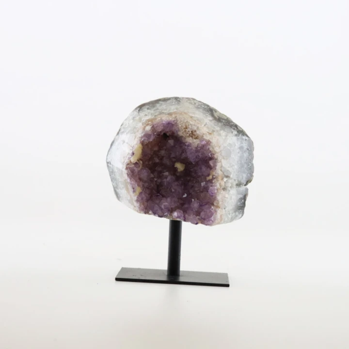 De kristallen in deze amethist zijn van hoge kwaliteit en tonen een schitterende paarskleurige glans. Het stuk is zorgvuldig geplaatst op een stevige zwarte metalen standaard, waardoor het perfect tot zijn recht komt als decoratief object én spirituele krachtbron.
