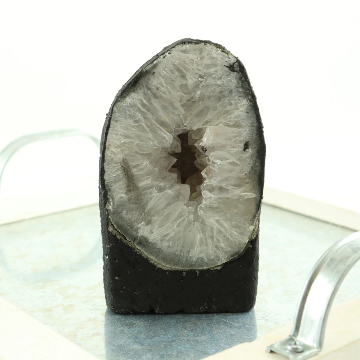 Een geode is een holle rotsformatie die van binnen is bedekt met kristallen. Amethist geodes, zoals de naam al aangeeft, bevatten amethistkristallen. Deze kristallen hebben een karakteristieke paarse kleur die varieert van lichtlavendel tot diep paars. Amethist geodes klein zijn, zoals de naam suggereert, kleinere exemplaren van deze rotsformaties, die vaak in verschillende delen van de wereld worden gevonden.