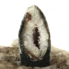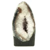Een geode is een holle rotsformatie die van binnen is bedekt met kristallen. Amethist geodes, zoals de naam al aangeeft, bevatten amethistkristallen. Deze kristallen hebben een karakteristieke paarse kleur die varieert van lichtlavendel tot diep paars. Amethist geodes klein zijn, zoals de naam suggereert, kleinere exemplaren van deze rotsformaties, die vaak in verschillende delen van de wereld worden gevonden.