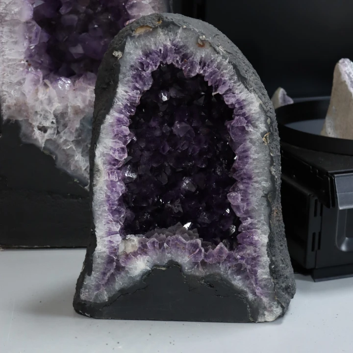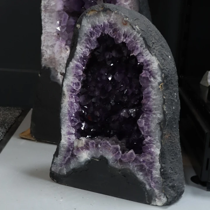 Amethist is een kwartsvariant die zijn kenmerkende paarse kleur dankt aan sporen van ijzer en blootstelling aan natuurlijke radioactieve straling diep in de aarde. De mooiste amethist geodes worden gevonden in Brazilië en Uruguay.