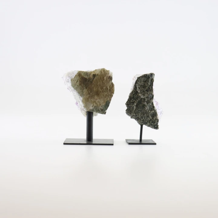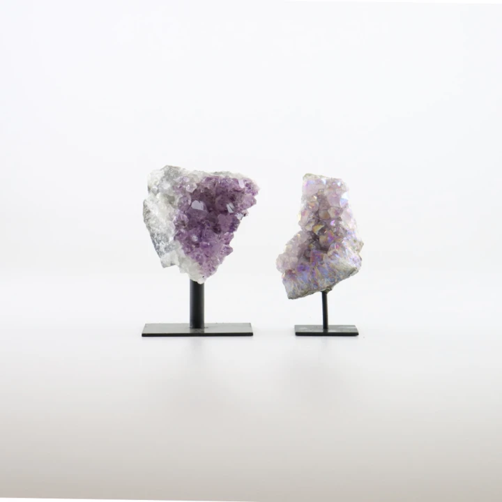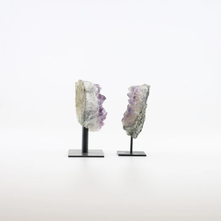 Amethist op standaard mini 2 stuks heeft een beschermende en zuiverende werking. De steen bevordert zelfinzicht en helpt je om eerlijk te zijn naar jezelf toe over gedrag dat schadelijk kan zijn en niet in dienst is van je hoogste zelf.
