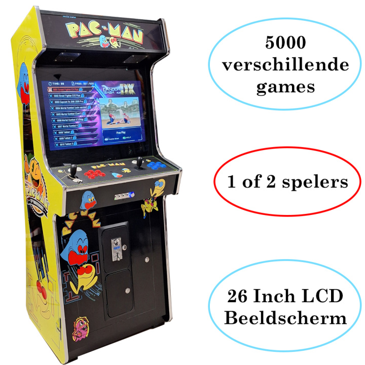 Deze compacte en stijlvolle arcade kast is voorzien van een iconisch Pac-Man design, wat hem tot een echte eyecatcher maakt in iedere gamekamer, mancave of horecagelegenheid.
