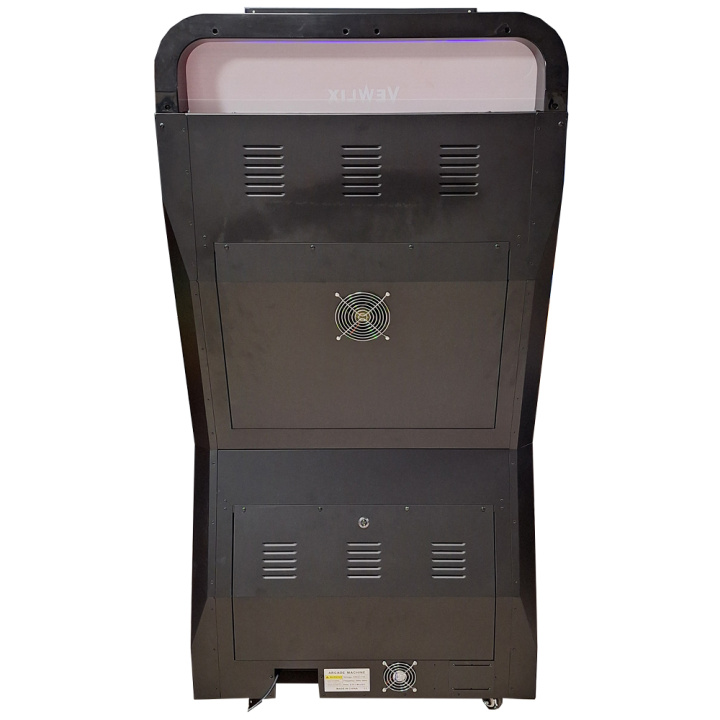 Deze arcade kast combineert een strak, modern ontwerp met de nostalgische charme van de klassieke speelhallen.