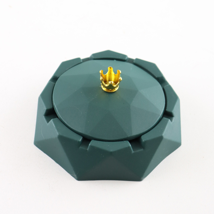 Deze asbak met kroon is een echte eyecatcher dankzij het strakke geometrische ontwerp en het opvallende gouden kroontje op de deksel. Perfect voor wie een elegante rookplek wil creëren, zowel binnen als buiten.