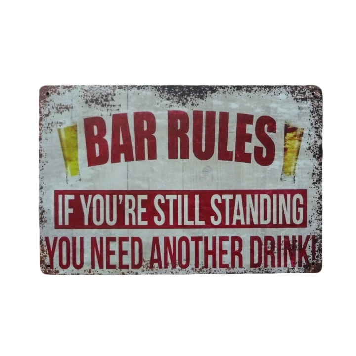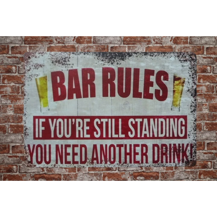 Bar Rules Metalen borden is een leuk en sfeervol decoratiestuk dat direct een gezellige en uitnodigende uitstraling geeft aan elke ruimte. Ideaal voor in de mancave, bar, café, keuken, schuur of tuin. Dankzij het humoristische ontwerp brengt dit bordje gegarandeerd een glimlach bij uw gasten.