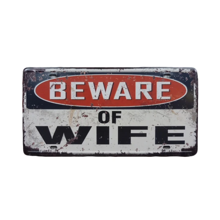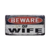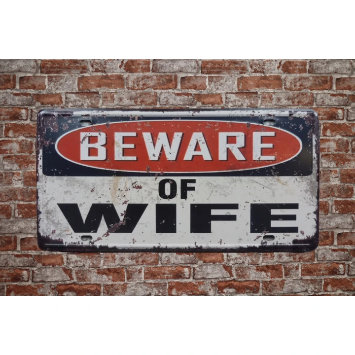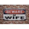 Beware of Wife Metalen borden is een bijzonder decoratiestuk / Wand decoratie voor aan uw muur. U kunt het bordje ophangen in bijvoorbeeld uw mancave, schuur, huis, bar, café, garage, werkplaats, buiten, hobby kamer of women cave.