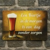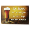 Het Een Biertje in de Morgen metalen bord is een humoristische toevoeging aan jouw interieur en brengt direct sfeer in je bar, mancave, keuken of hobbyruimte. Met de grappige tekst “Een biertje in de morgen is een dag zonder zorgen” tover je gegarandeerd een glimlach op het gezicht van je gasten.
