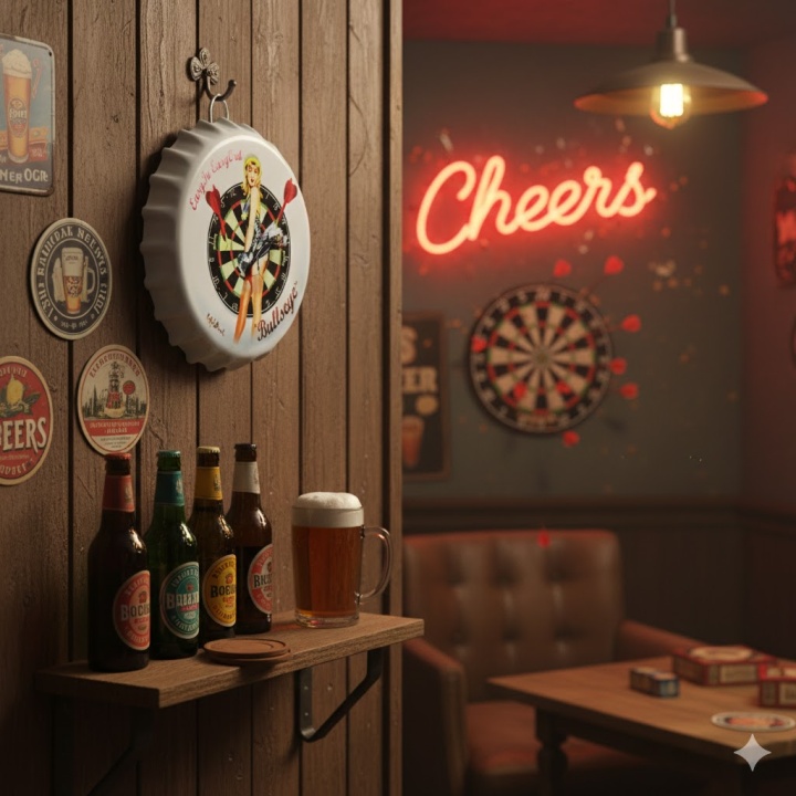 Het opvallende design combineert een dartbord met een retro afbeelding van een vrouw wiens rok omhoog waait, wat zorgt voor een vleugje nostalgie en humor.