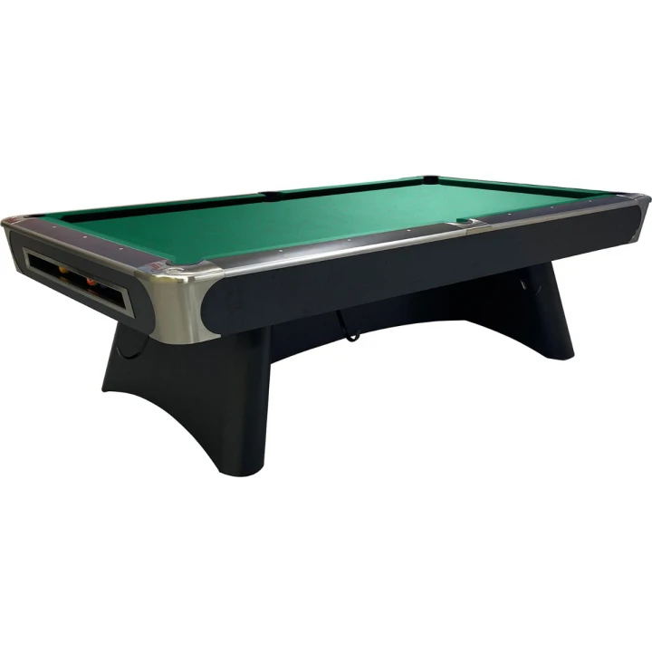 Deze pooltafel is uitgerust met een 3-delige leistenen speelveld van 25 mm dik, wat zorgt voor een stabiel en nauwkeurig speeloppervlak. De toprail is gemaakt van 45 mm massief hout en afgewerkt met matzwart laminaat, waardoor de tafel niet alleen stevig maar ook visueel aantrekkelijk is.