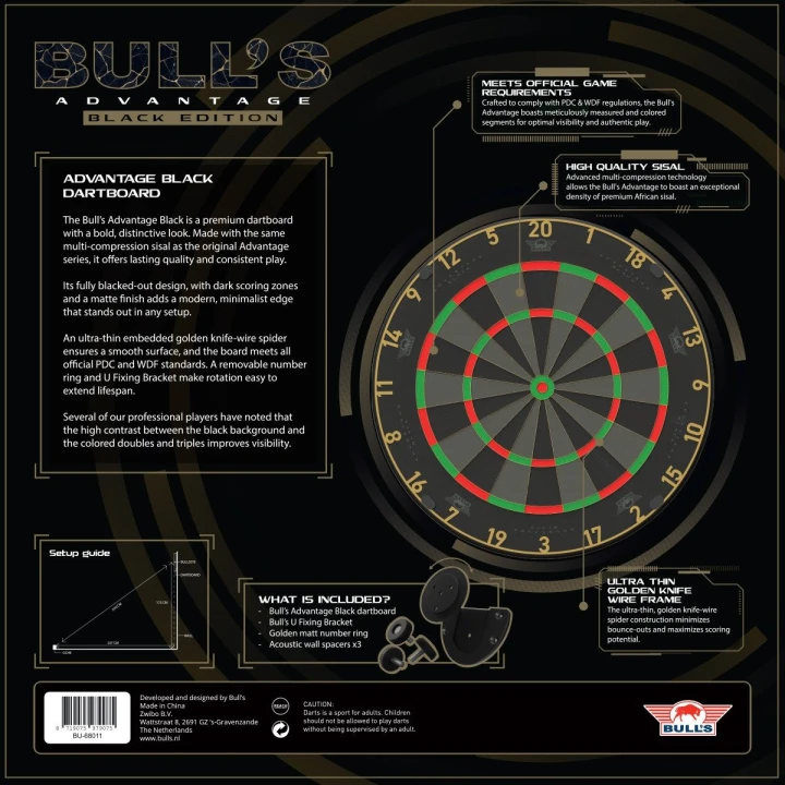 Dan is het Bulls Advantage Black Edition Dartbord de perfecte keuze voor jou. Met zijn volledig zwarte uitvoering en niet-reflecterende cijfers past dit dartbord perfect in elke moderne mancave of speelruimte.