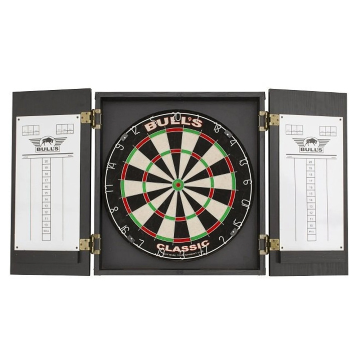 Deze dartkast is gemaakt van hout en uitgevoerd in klassiek zwart.