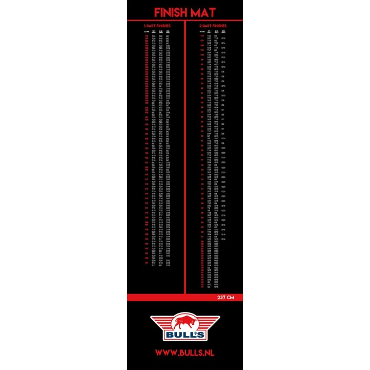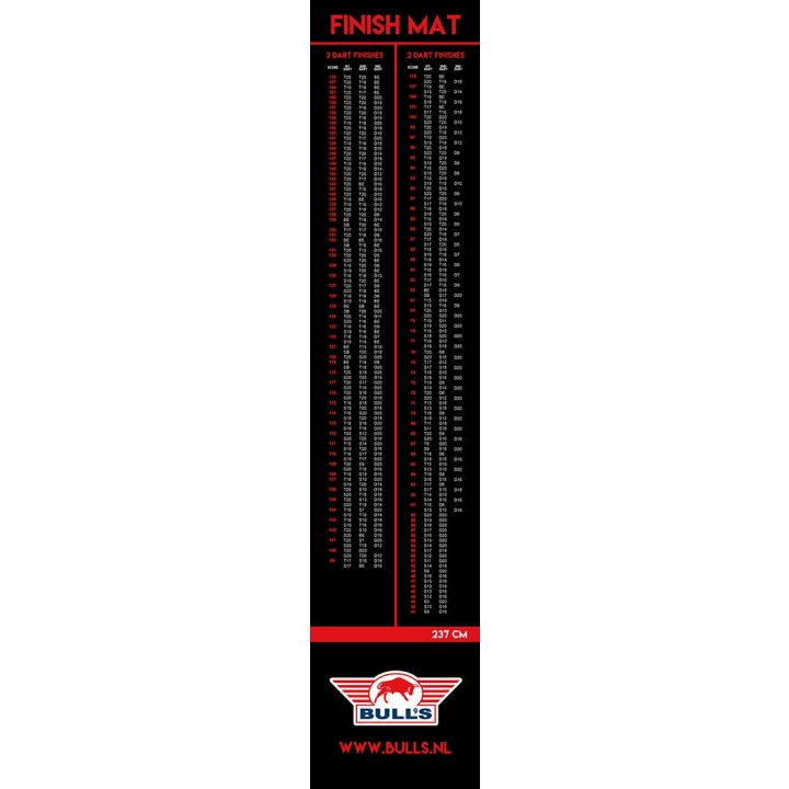 Bull’s Carpet Finishmat voorzien van een streep die de gooiafstand aangeeft en voorzien van een afbeelding met alle uitgooi mogelijkheden en een Bull`s logo.