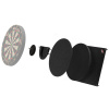 Dankzij het universele formaat past hij achter elk standaard dartbord.