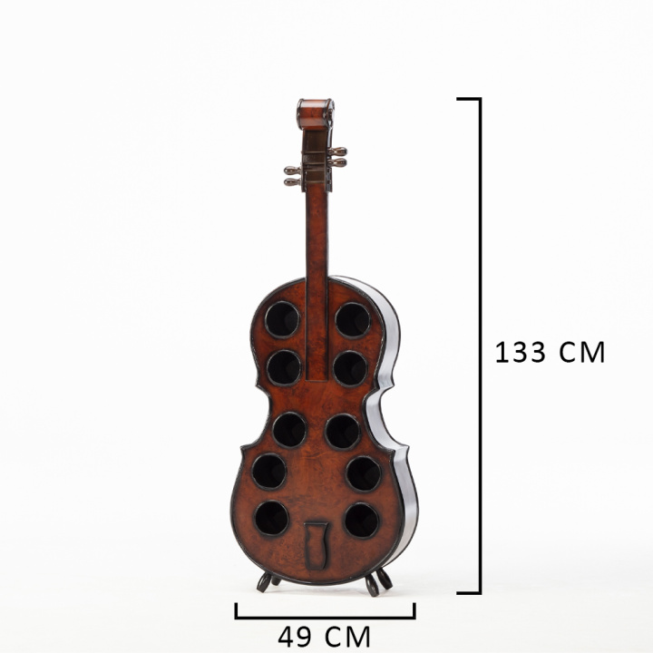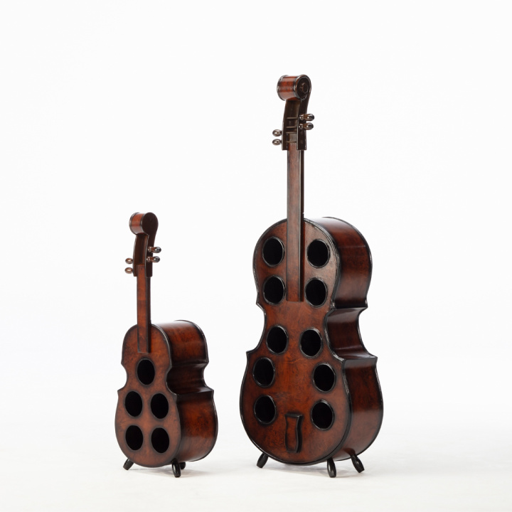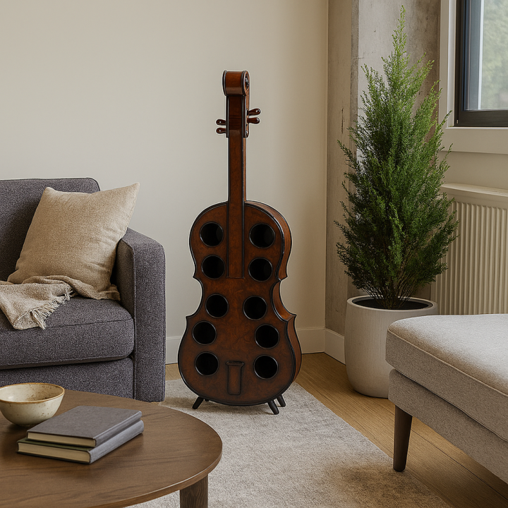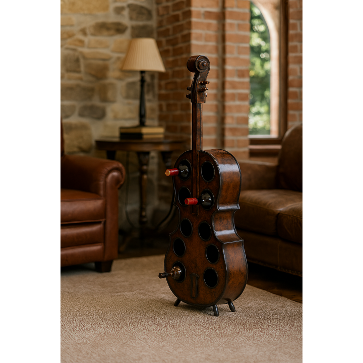 Deze unieke wijnhouder in de vorm van een cello is een echte blikvanger voor elke ruimte.