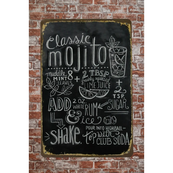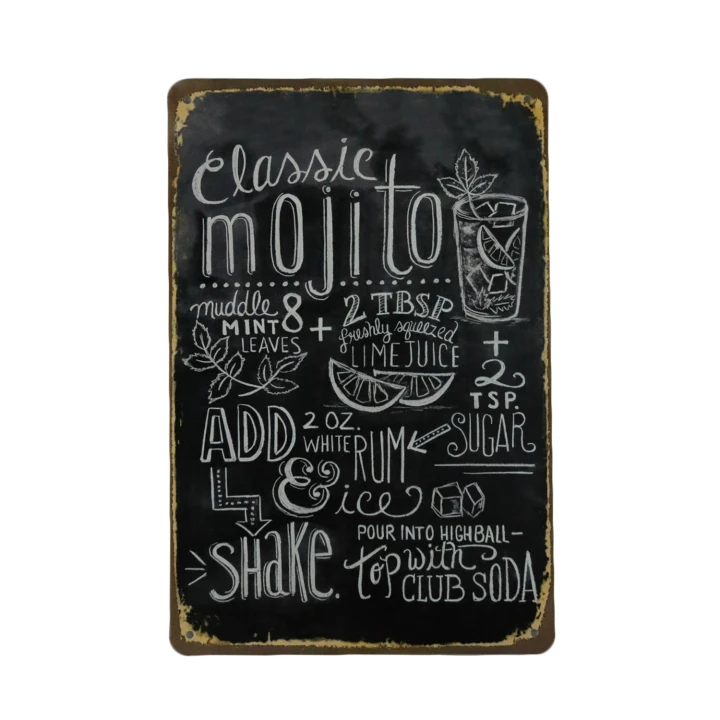 Het Classic Mojito metalen bord is gemaakt van stevig metaal en bedrukt met UV-bestendige en eco-vriendelijke inkt. Hierdoor is het bestand tegen zonlicht en weer, waardoor je het zowel binnen als buiten kunt ophangen. Of je het nu aan de muur hangt in je hobbykamer of op het balkon, dit bord blijft jarenlang mooi.