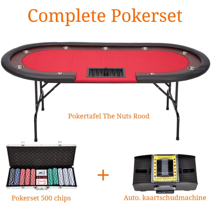 Met de Complete Pokertafel Set The Nuts Rood ben je klaar om een onvergetelijk pokertoernooi te organiseren. Bestel vandaag nog en maak van jouw pokeravonden een waar succes!