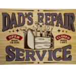 Dads repair service – Metalen borden is een bijzonder decoratiestuk / Wand decoratie voor aan uw muur. U kunt het bordje ophangen in bijvoorbeeld uw mancave, schuur, huis, bar, café of garage.