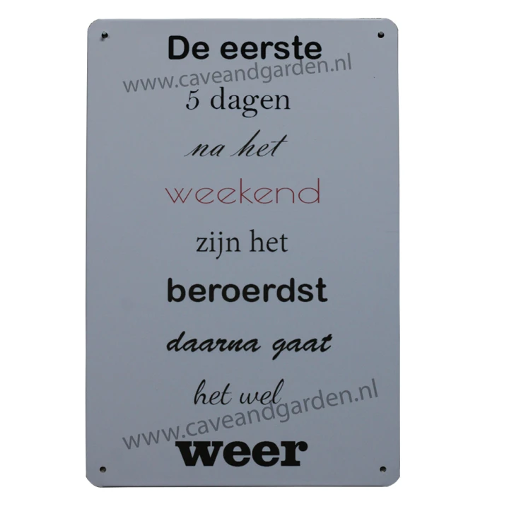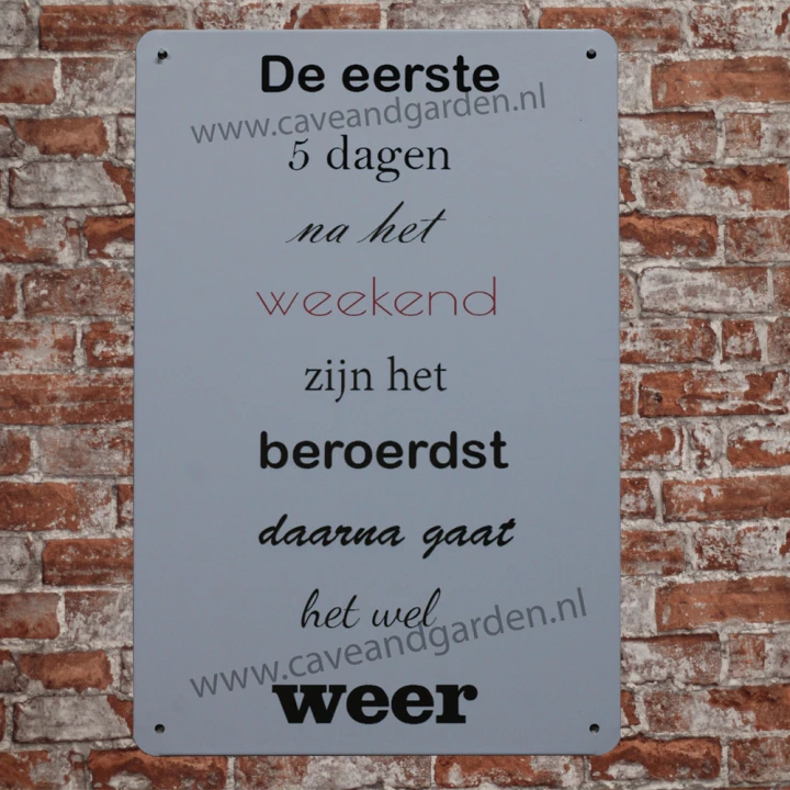 De eerste 5 dagen Metalen borden is een bijzonder decoratiestuk / Wand decoratie voor aan uw muur. U kunt het bordje ophangen in bijvoorbeeld uw mancave, schuur, huis, bar, café, garage, werkplaats, buiten, hobby kamer of women cave.