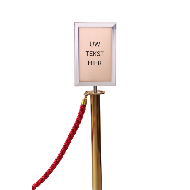 De display biedt ruimte voor een A4-papiertje (liggend formaat) waarin je zelf een tekst, logo of afbeelding kunt plaatsen. Dankzij het dubbelzijdige ontwerp is de boodschap aan beide kanten goed leesbaar ideaal voor gebruik in entrees, wachtrijen of evenementen.