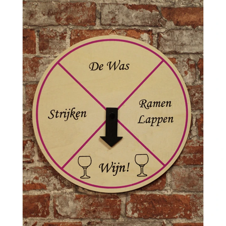 Het geheim? Het wiel is ontworpen om altijd te eindigen op wine drinken wat betekent dat je geen kans hebt om vervelende klusjes op te pakken!