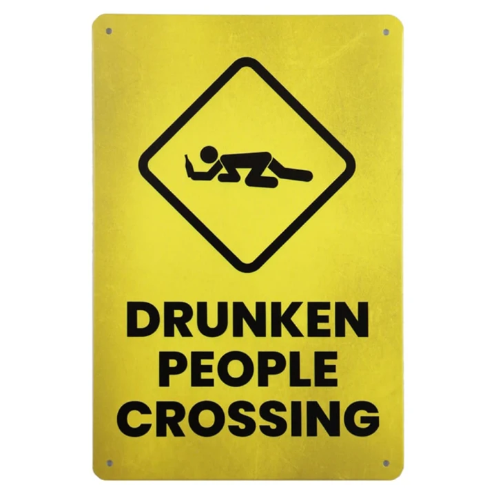 Het Drunken People Crossing metalen bord is een humoristisch decoratiestuk voor elke mancave, bar of café.