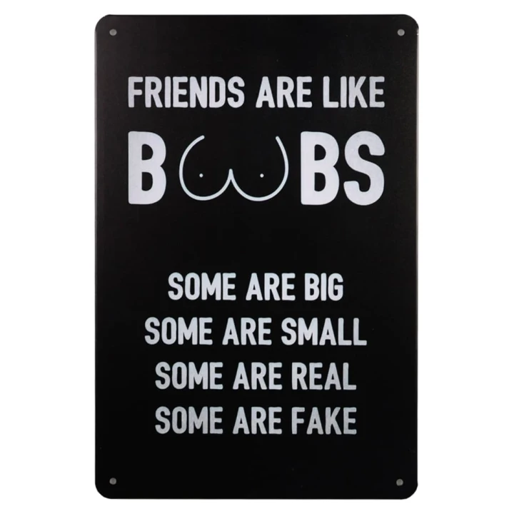 Breng een lach en een beetje humor in je ruimte met dit unieke metalen bordje van 20 x 30 cm, voorzien van de grappige tekst: “Friends are like boobs. Some are big, some are small, some are real, some are fake.”