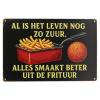 Voor de echte liefhebbers van snacks en humor: dit metalen bordje met de tekst “Al is het leven nog zo zuur, alles smaakt beter uit de frituur” is een smaakvolle toevoeging aan je interieur. Perfect voor de keuken, snackbar, eetruimte of mancave en gegarandeerd goed voor een glimlach (en trek in iets lekkers).
