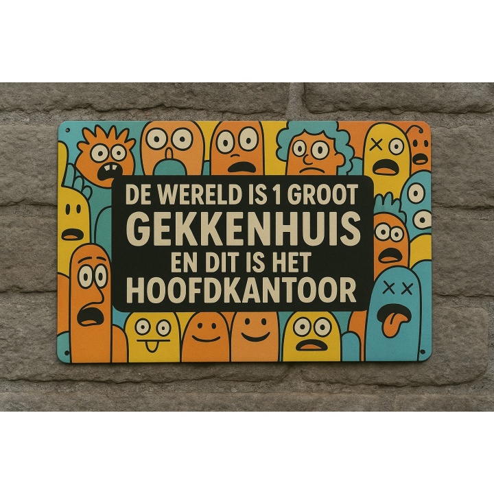 Breng een flinke dosis humor aan je muur met dit kleurrijke metalen bordje “De wereld is 1 groot gekkenhuis en dit is het hoofdkantoor”.