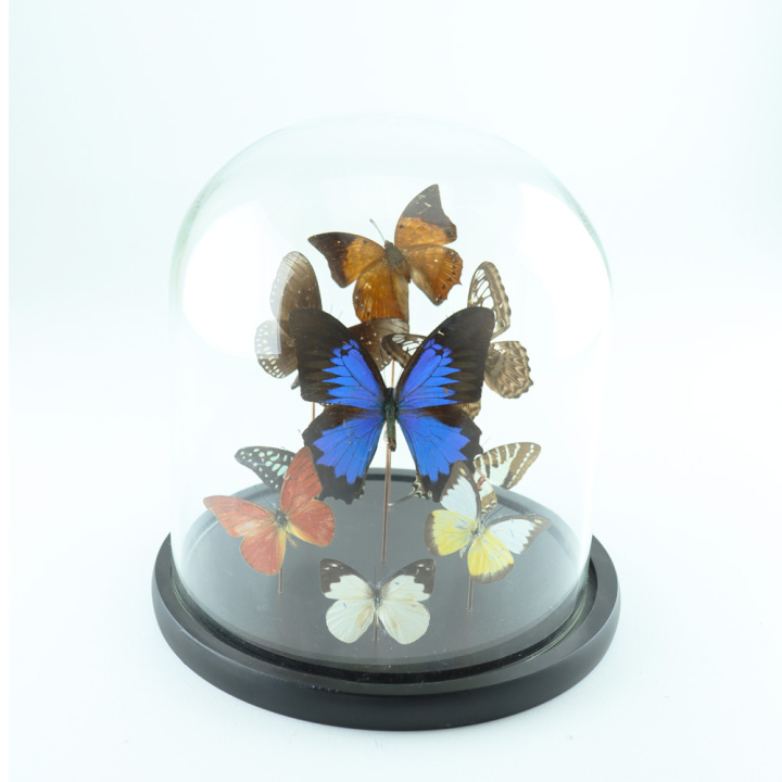 De vlinders in deze stolp zijn afkomstig uit ethisch verantwoorde bronnen en worden gepresenteerd in een harmonieuze opstelling. De diverse kleuren en patronen zorgen voor een speels en dynamisch effect, waardoor dit natuurkunstwerk vanuit elke hoek fascineert. De glazen stolp biedt niet alleen bescherming tegen stof en beschadigingen, maar versterkt ook de elegante uitstraling van de vlinders.
