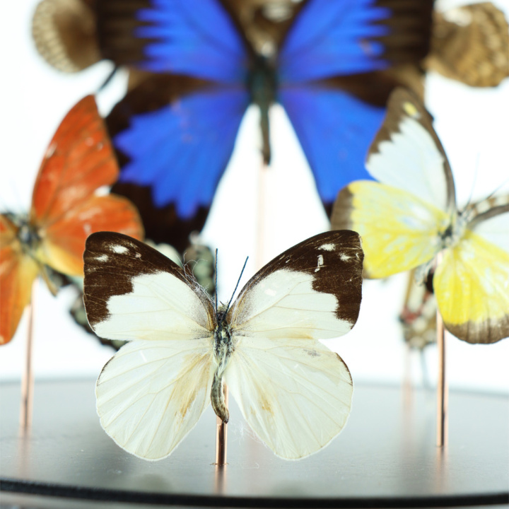 ✔ Natuurlijke schoonheid – Elke stolp is uniek en bevat een gevarieerde mix van vlindersoorten met hun eigen kleurenpracht.