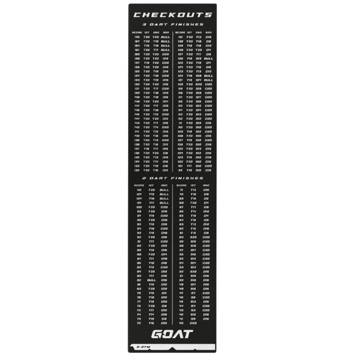 Deze stevige dartmat van GOAT beschermt je vloer en helpt je met het uitgooien dankzij het handige checkout-overzicht voor 2- en 3-dart finishes.