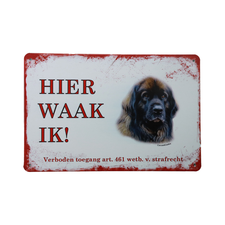 Laat iedereen weten dat jouw Leonberger over het huis waakt met het Hier Waak Ik Leonberger metalen wandbord van Cave & Garden.