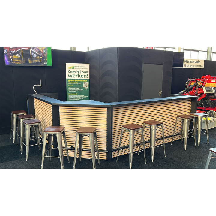 Gebruik hem als beursbar, evenementenbar, promotiebalie, horecabar of bedrijfsbar. Dankzij het robuuste houten ontwerp en de moderne afwerking met akoestische panelen straalt deze bar kwaliteit en professionaliteit uit.