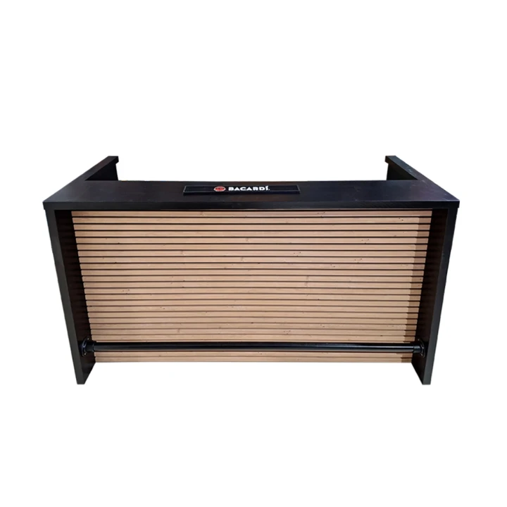 De stijlvolle licht eiken akoestische panelen aan de voorzijde zorgen niet alleen voor een moderne uitstraling, maar dragen ook bij aan een warme, gezellige sfeer. Deze combinatie van hout en zwarte lak geeft de bar een stijlvolle uitstraling die perfect past in zowel moderne als industriële interieurs.