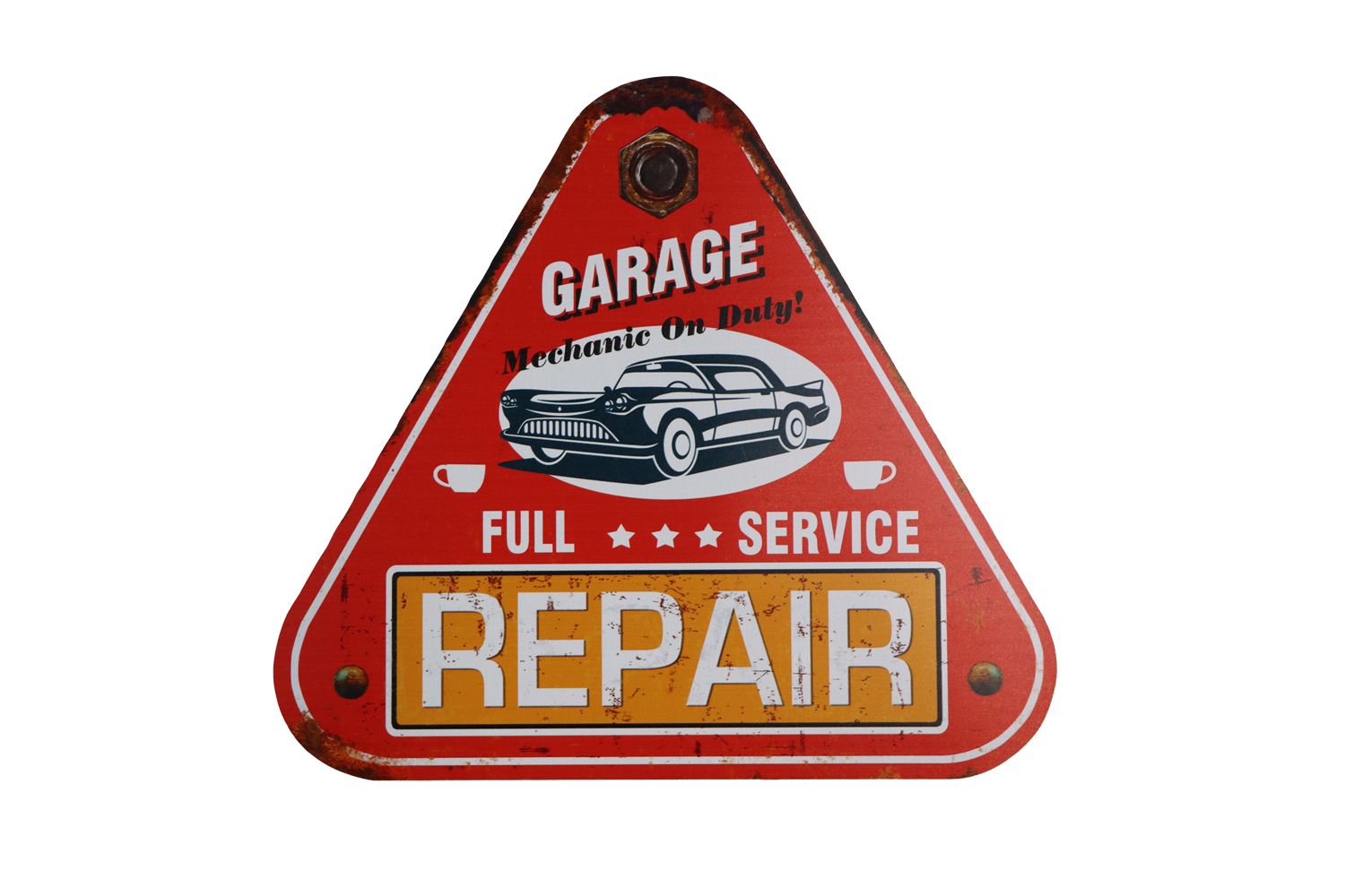 Tekstbord in de vorm van een driehoek leuk om op te hangen voor een garage sfeer.