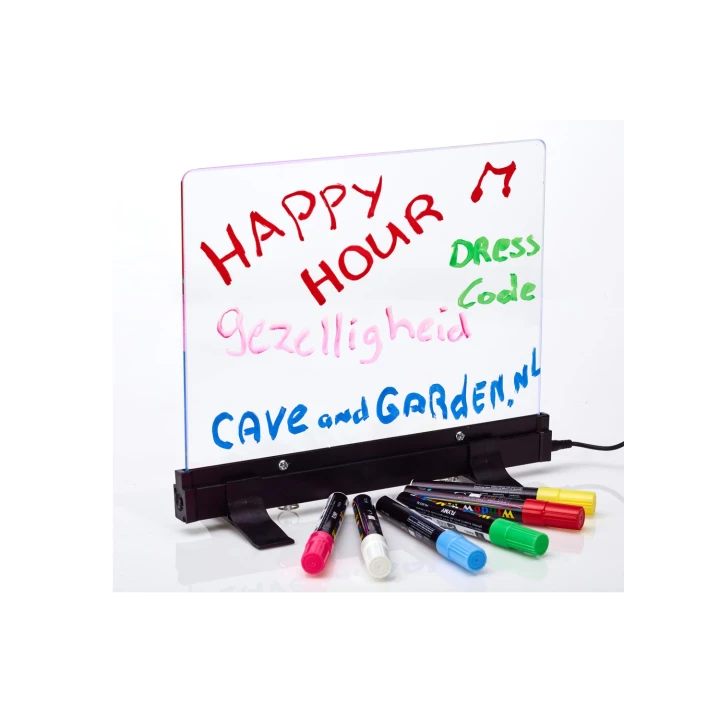 Dit led schrijfbord word geleverd met 6 verschillende kleuren marker stiften. Dit bord komt pas echt tot leven als je het aanzet. De kleuren worden neon weergegeven waar door je een super leuk effect krijgt. Dit bord kan worden gebruikt voor reclame doeleinden of ter decoratie. Extra gekleurde markers ook verkrijgbaar. Makkelijk schoon te maken met een vochtig doekje .
