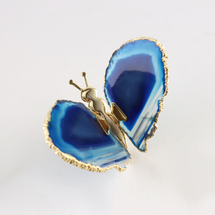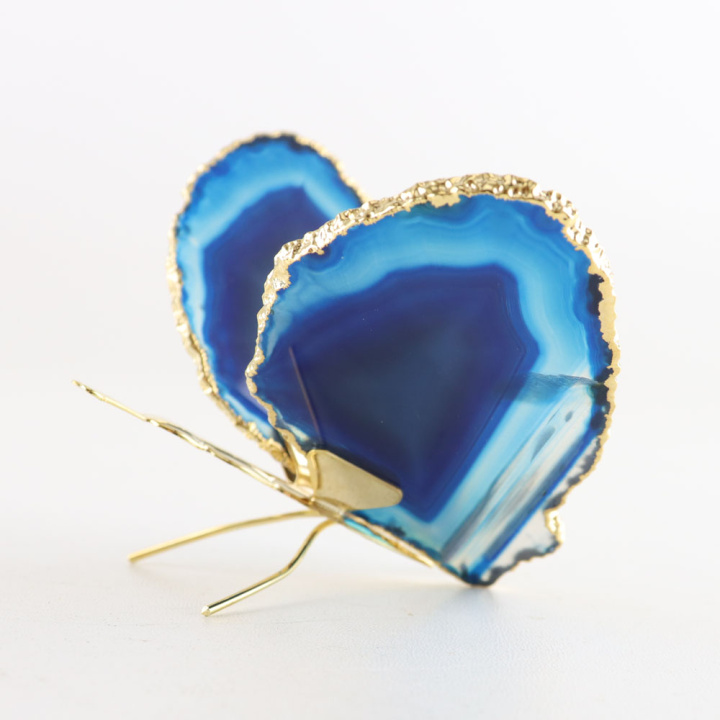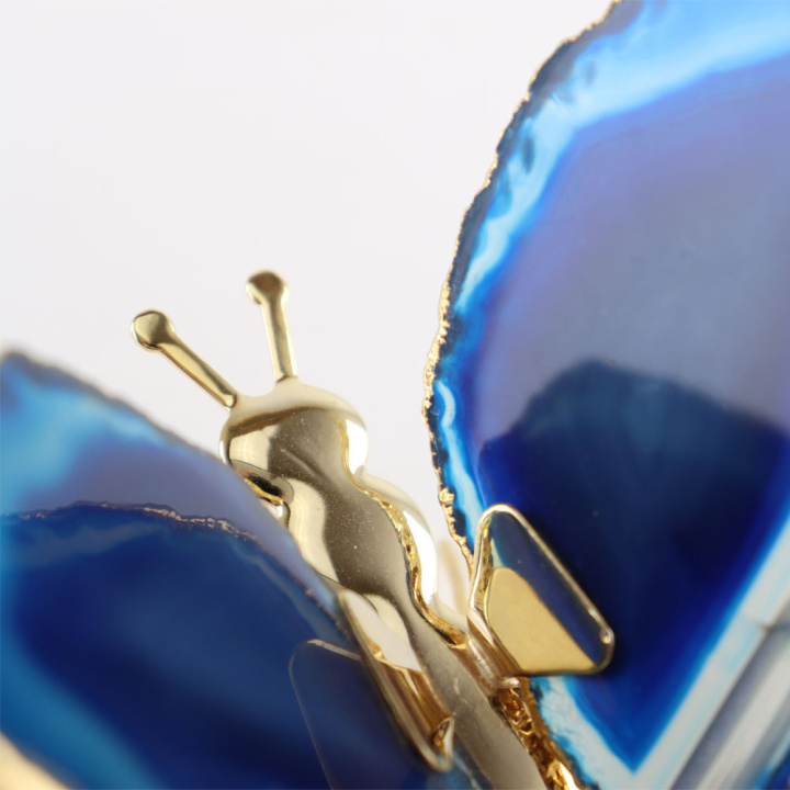 Deze luxe blauwe agaat vlinder met gouden details is een prachtige edelsteen decoratie. De buigbare gouden pootjes maken het eenvoudig om de vlinder in de perfecte positie te plaatsen. Ideaal voor interieurdecoratie en spiritueel gebruik.
