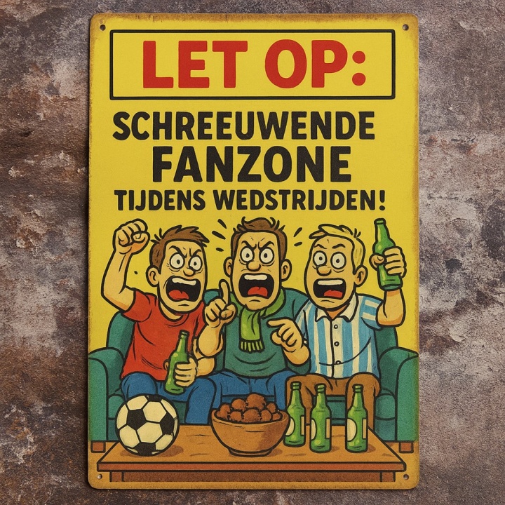 Laat bezoekers meteen weten wat ze kunnen verwachten tijdens de wedstrijd met dit opvallende metalen bordje: “Let op: Schreeuwende Fanzone tijdens wedstrijden!”.