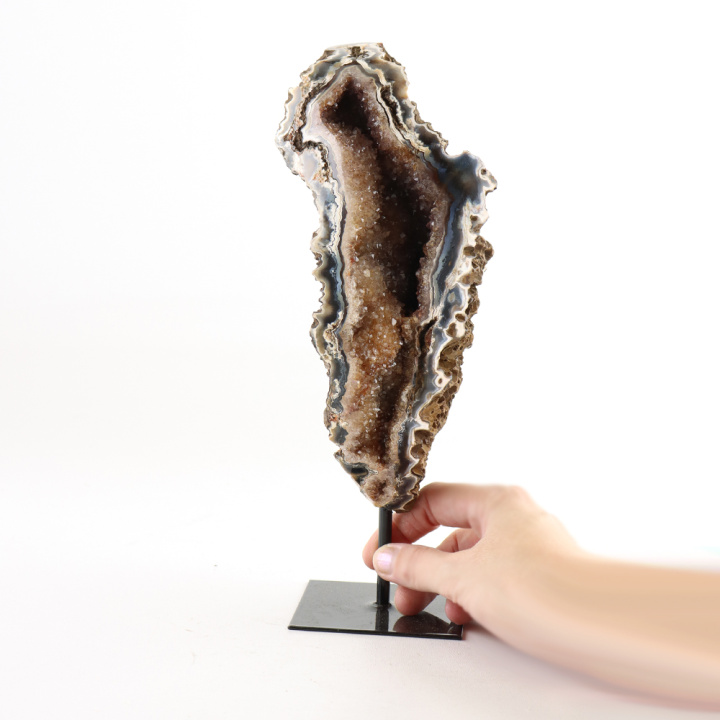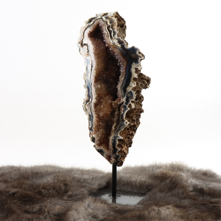 Mooie agaat rots op standaard, met unieke ruwe vormen en natuurlijke kristalstructuur. Een krachtig stuk natuur voor jouw interieur. Snelle levering bij Cave & Garden.