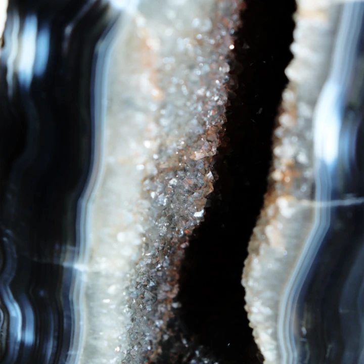 Dit zorgt voor de gestreepte patronen die vaak op agaten te zien zijn. In sommige gevallen zijn de holtes bekleed met kristallen, deze worden geodes genoemd.