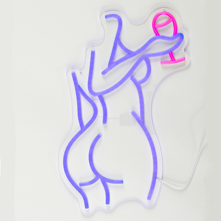 Voeg een opvallend lichtaccent toe aan je interieur met dit stijlvolle neon bord vrouw met een cocktailglas. De elegante vormen en felle kleuren zorgen voor een speelse en tegelijkertijd chique uitstraling. Perfect voor gebruik in een thuisbar, mancave, café of feestlocatie. De lijnen van de vrouw worden verlicht in helder wit en paars, met een roze accent in het glas. Een echte eyecatcher die zorgt voor een unieke sfeer.