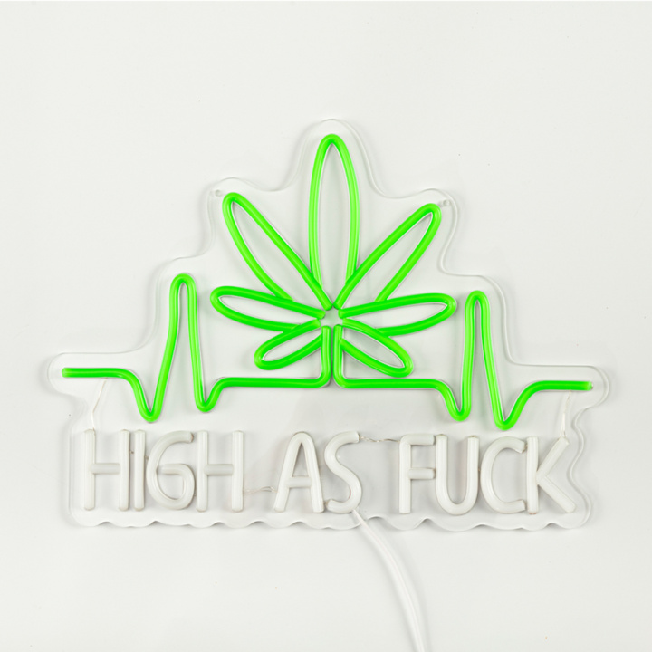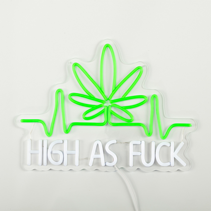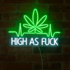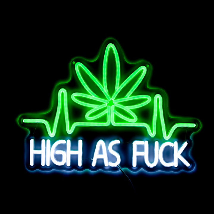 Maak een statement met dit unieke neon bord wiet! De combinatie van een felgroen wietblad met daaronder de witte neon tekst ‘High As Fuck’ maakt dit bord een echte sfeermaker in elke ruimte. Of je het nu ophangt in je mancave, rookruimte, studentenhuis of bar: dit neonbord trekt direct de aandacht.