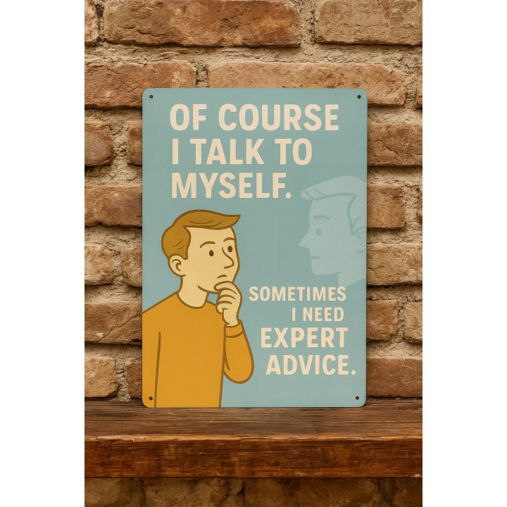 Grappig metalen wandbord met de tekst “Of course I talk to myself. Sometimes I need expert advice.”. Ideaal voor iedereen met een gezonde dosis zelfspot.