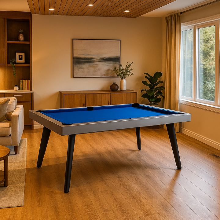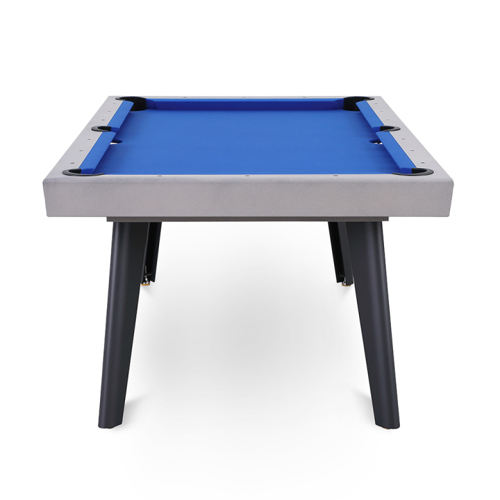 Het speelveld is van natuursteen (leisteen) en afgewerkt met professioneel, waterdicht pooldoek in helder zwembadblauw. Dit zorgt voor een soepele en snelle speelervaring, ook buiten.