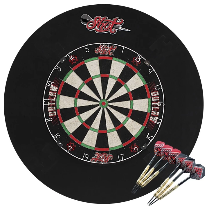 De dart set bevat een Shot! Outlaw sisal dartbord, twee setjes brass dartpijlen, een gooilijn en een surround. ‘Een complete dart set’.
